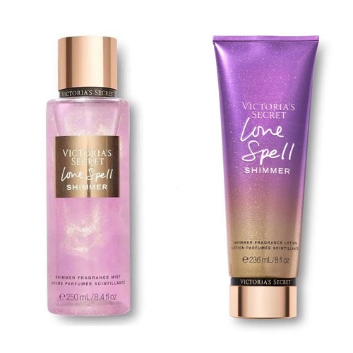Kit Victoria's Secret Love Spell na linha Shimmer, com um brilho de glitter bem suave.